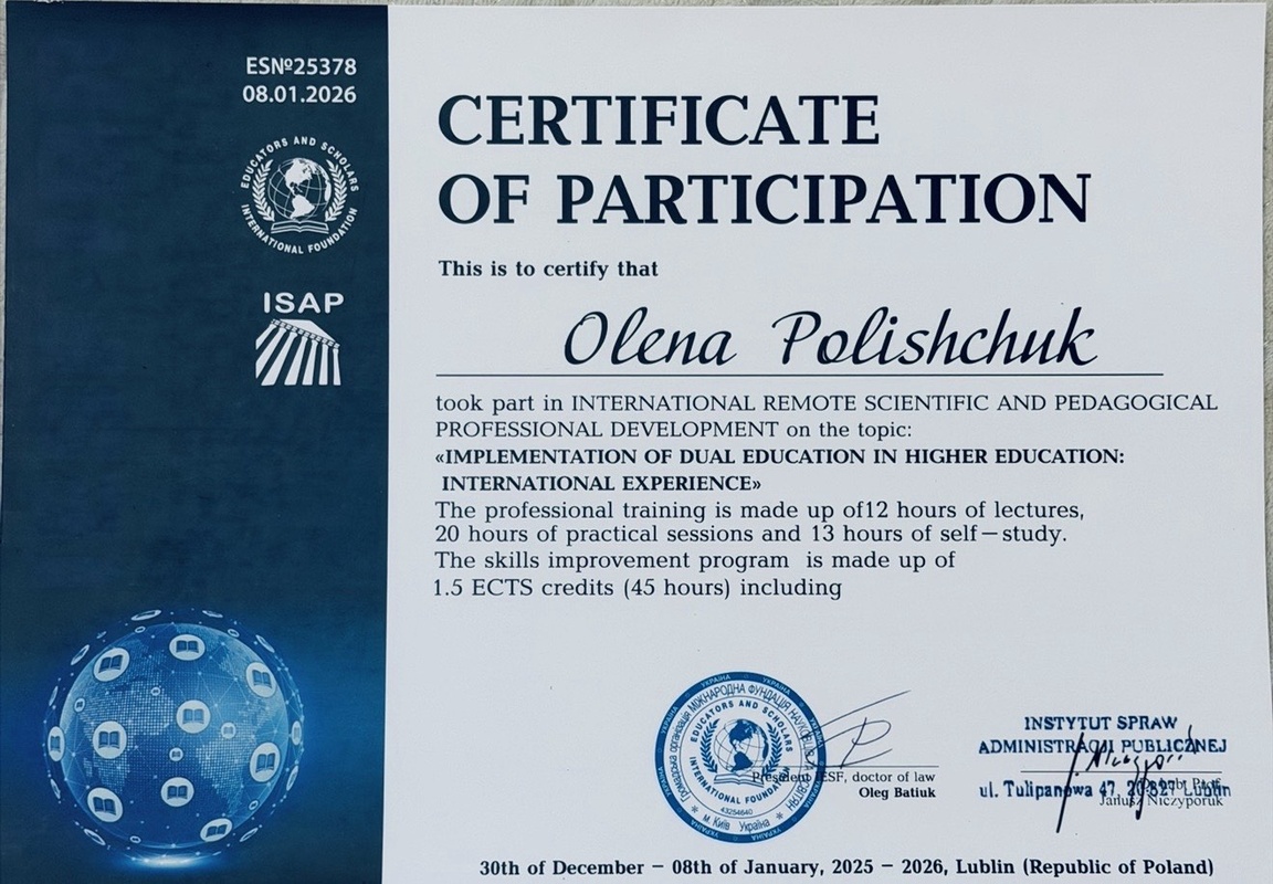 Доцентка кафедри соціально-гуманітарних і правових дисциплін Уманського національного університету Олена ПОЛІЩУК успішно пройшла міжнародне дистанційне науково-педагогічне підвищення кваліфікації «Використання дуальної освіти при підготовці здобувачів вищої освіти: міжнародний досвід»